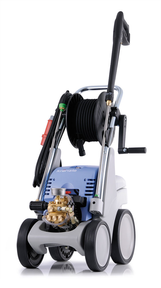 Profesionální vysokotlaký studenovodní čistič na čtyřkolém podvozku s navíjecím bubnem, rotační tryskou a funkcní Total-Stop v základní výbavě. S pracovním tlakem 150 Barů a množstvím vody 12 l/min je tento stroj vhodný např. na mytí vozů nebo pro průmyslové i domácí použití.