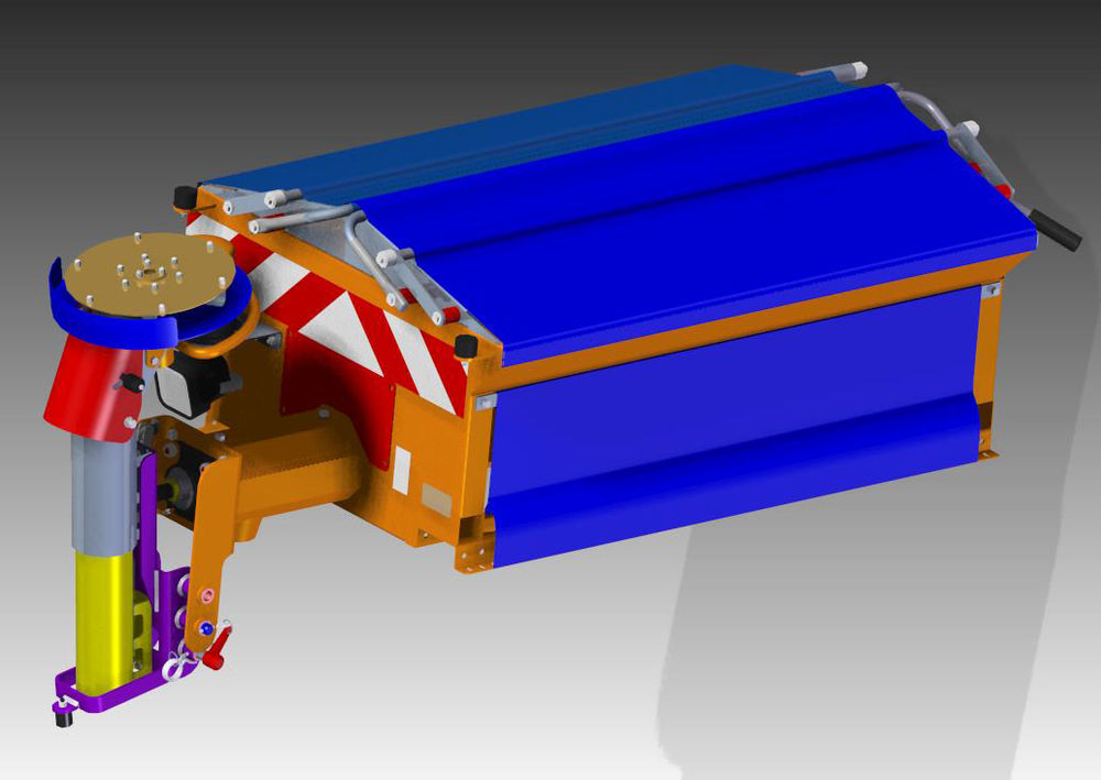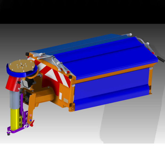 Ocelový zásobník na posypový materiál. V jeho spodní části je umístěn šnekový dopravník poháněný hydromotorem, jehož úkolem je vynášet materiál ven ze zásobníku k rozmetadlu. Zásobník má kónický tvar, To znamená, že se směrem ke šnekovému dopravníku zužuje a tím podporuje samovolný postup materiálu směrem k dopravníku.
