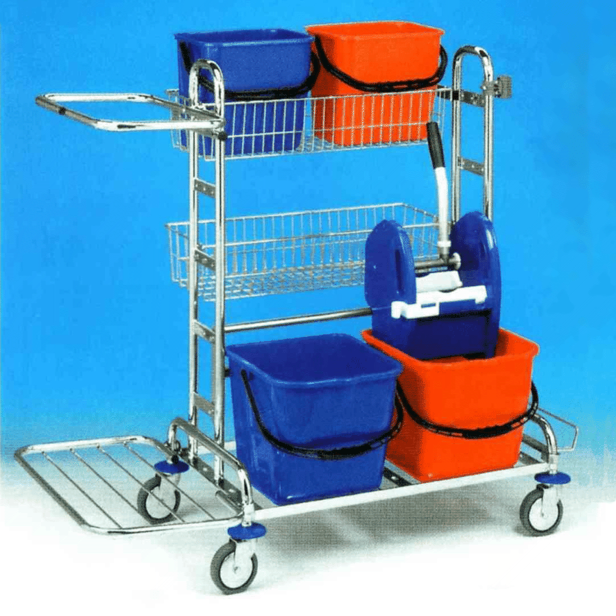 Kompletní úklidový vozík vybavený podvozkem s dvěma bočními držáky, držákem ždímače, držákem pytle 120l, roštem, podpěrou mopu, 2x košem KOMBI, 2x kbelíkem 17l, 2x kabelíkem 13l, ždímačem a držákem ALU tyče